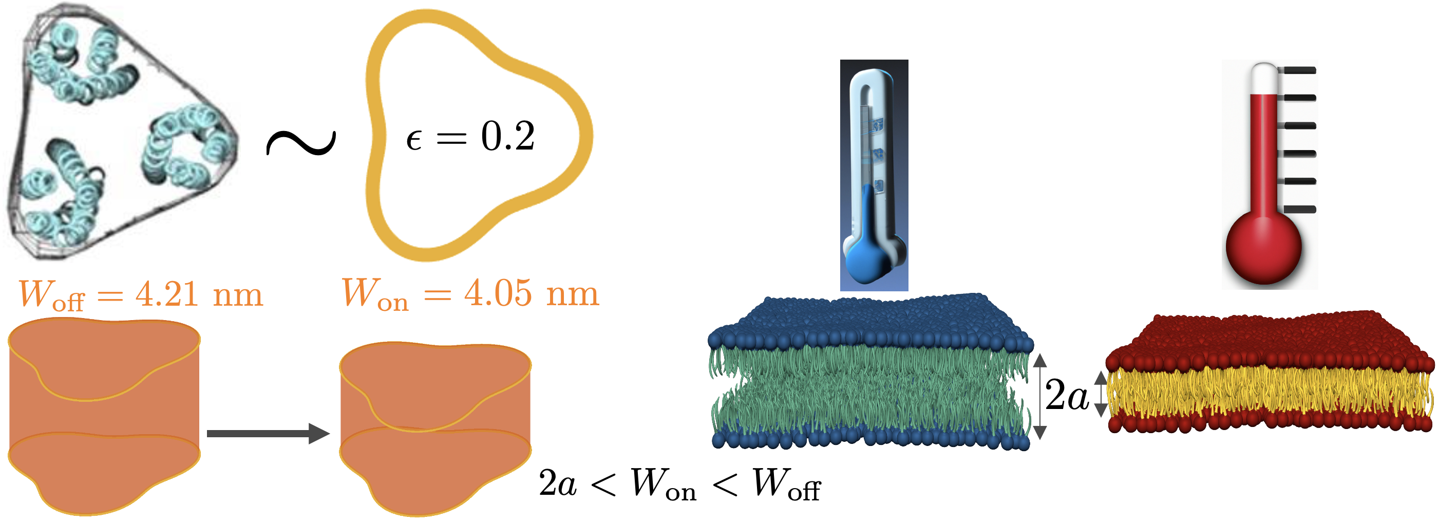 We can model a chemoreceptor as a button with a 3-leaf clover cross-section shape in a bilayer with mechanical properties, including unperturbed thicknesses, that are dependent on temperature. (image credits: left side image with chemoreceptor structure and shape model comes from [Liu et. al., 2012, Haselwandter and Wingreen, 2014] and right side with warmer temperature decreasing bilayer thickness concept is from [Pan et. al., 2008] where we created the warm and cold bilayer images with Blender.)